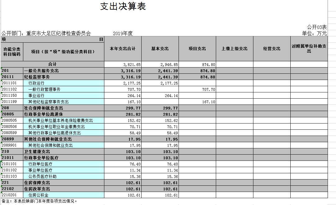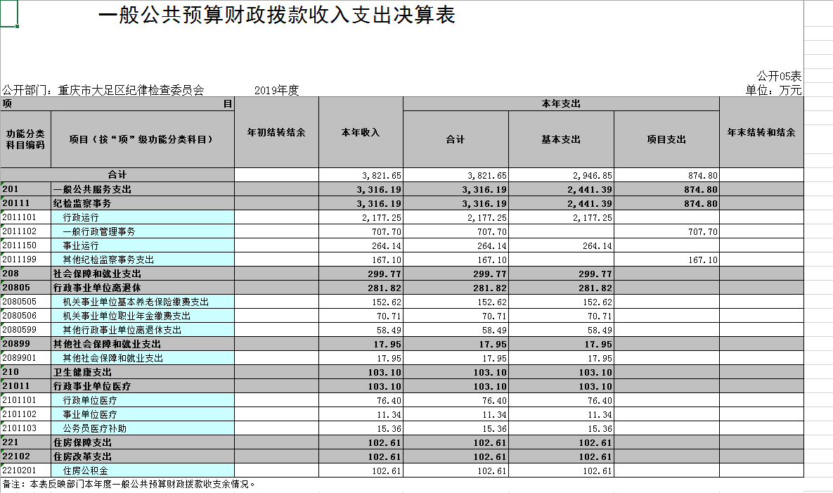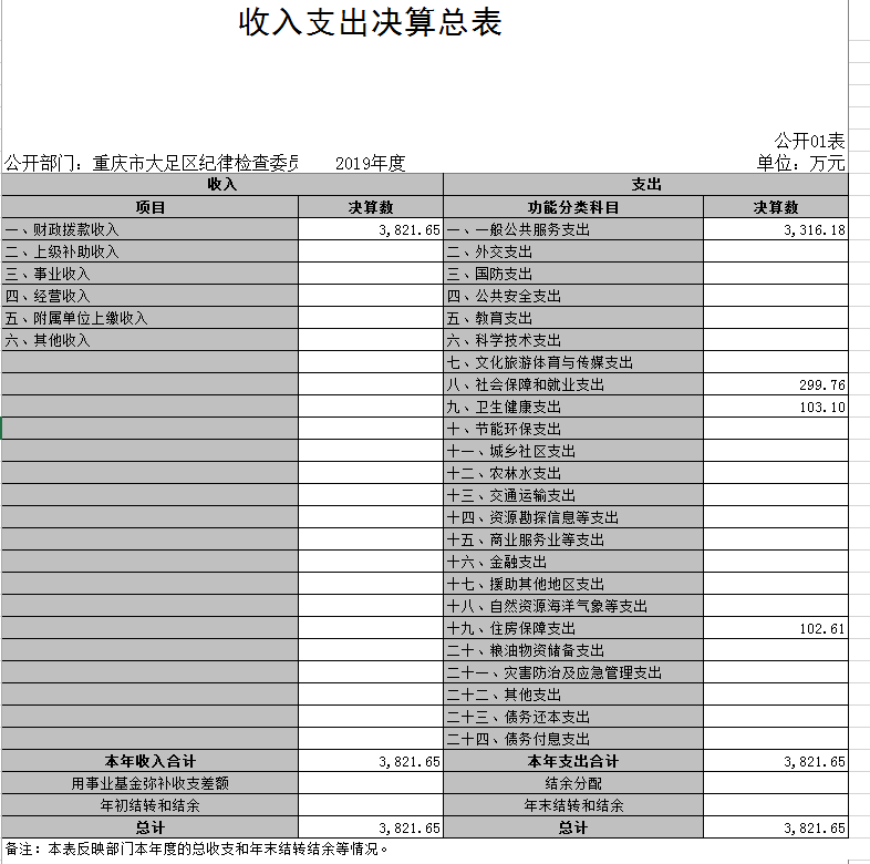 1.总体情况。2019年度收入总计3,821.65万元,支出总计3,821.65万元。收支较上年决算数增加1,762.87万元、增长85.63%,主要原因一是全区13个纪检组、7个监察室及检察转隶同志共80余人全年工资及其他福利待遇纳入纪委机关保障。二是留置中心正常运行。主要用于保障在职人员工资福利及社会保险缴费、退休员补助、公务车辆运行维护及其他各项商品服务支出。本部分的收入总计包括收入合计、用事业基金弥补收支差额、年初结转和结余,支出总计包括本年支出合计、结余分配、年末结转和结余。