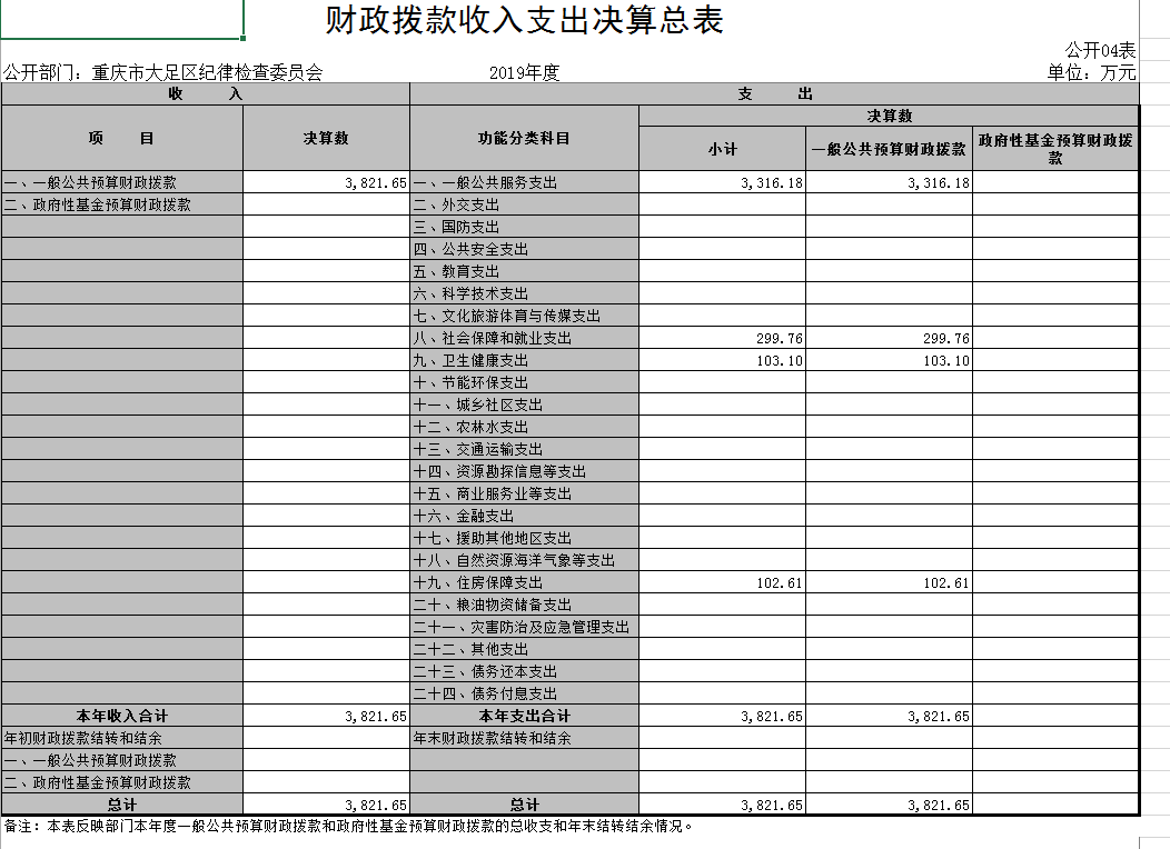 2019年度财政拨款收、支总计3,821.65万元。与2018年相比,财政拨款收、支总计各增加1,762.87万元,增长85.63%。主要原因一是全区13个纪检组、7个监察室及检察转隶同志共80余人全年工资及其他福利待遇纳入纪委机关保障。二是留置中心正常运行。主要用于保障在职人员工资福利及社会保险缴费、退休员补助、公务车辆运行维护及其他各项商品服务支出。