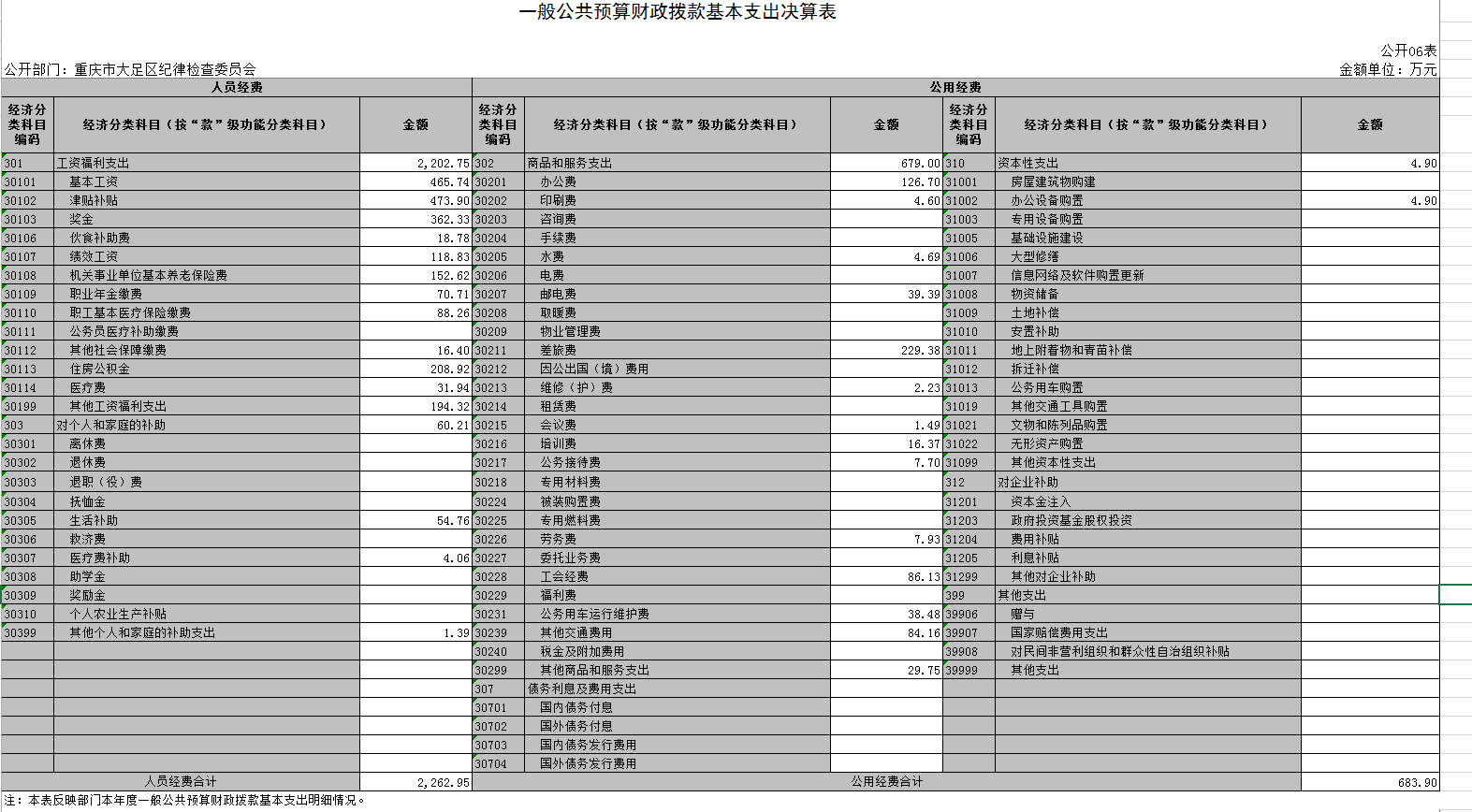 2019年度一般公共财政拨款基本支出2,946.85万元。其中:人员经费2,262.95万元,较上年决算数增加1,119.05万元,增长97.83%,主要原因是全区13个纪检组、7个监察室及检察转隶同志共80余人全年工资及其他福利待遇纳入纪委机关保障。人员经费用途主要包括基本工资、津贴补贴、奖金、社会保障缴费、绩效工资及其他工资福利。公用经费683.90万元,较上年决算数增加530.98万元,增长347.23%,主要原因是人员增加及全区人员定额公用经费统一调整。公用经费用途主要包括办公费、印刷费、邮电费、会议费、接待费、劳务费、差旅费、工会经费、公务车辆运行维护费及其他商品服务支出。